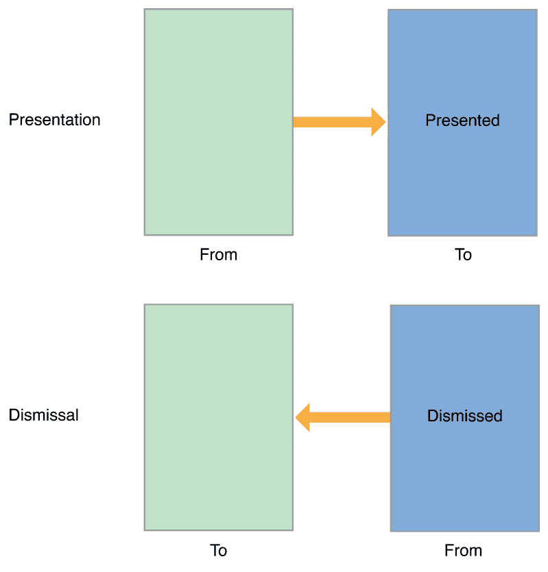 這也是一組相對的概念,它容易與fromView和toView混淆。簡單來說,它不受present或dismiss的影響,如果是從A視圖控制器present到B,那么A總是presentedViewController,B總是presentingViewController。