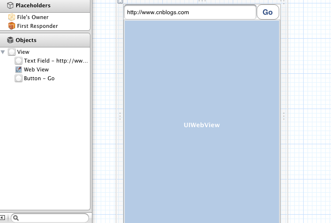 - (void)loadWebPageWithString:(NSString*)urlString{ NSURL *url =[NSURL URLWithString:urlString]; NSLog(urlString); NSURLRequest *request =[NSURLRequest requestWithURL:url]; [webView loadRequest:request];}在界面上放置3個控件,一個textfield、一個button、一個uiwebview,布局如下: