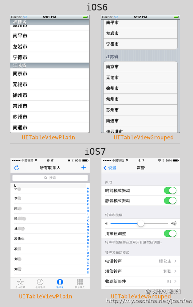 ⑦運行即可得到圖5的效果,將初始化時的style改為UITableViewStyleGrouped即可得到圖6的效果