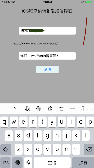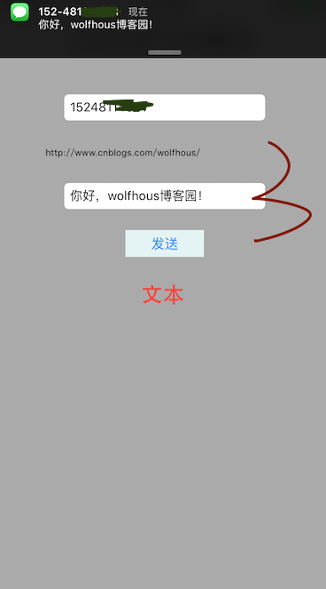 /** 點擊發(fā)送短信按鈕*/- (IBAction)sendMessageBut:(id)sender {/** 如果可以發(fā)送文本消息(不在模擬器情況下*/if ([MFMessageComposeViewController canSendText]) {/** 創(chuàng)建短信界面(控制器*/MFMessageComposeViewController *controller = [MFMessageComposeViewController new];controller.recipients = @[self.phoneTextField.text];//短信接受者為一個NSArray數(shù)組controller.body = self.messageBody.text;//短信內(nèi)容controller.messageComposeDelegate = self;//設(shè)置代理,代理可不是 controller.delegate = self 哦!!!/** 取消按鈕的顏色(附帶,可不寫) */controller.navigationBar.tintColor = [UIColor redColor];[self presentViewController:controller animated:YES completion:nil];}else{NSLog(@"模擬器不支持發(fā)送短信");}}#pragma mark - MFMessageComposeViewControllerDelegate/*** 協(xié)議方法,在信息界面處理完信息結(jié)果時調(diào)用(比如點擊發(fā)送,取消發(fā)送,發(fā)送失敗)** @param controller 信息控制器* @param result 返回的信息發(fā)送成功與否狀態(tài)*/- (void)messageComposeViewController:(MFMessageComposeViewController *)controller didFinishWithResult:(MessageComposeResult)result{/** 發(fā)送完信息就回到原程序*/[self dismissViewControllerAnimated:YES completion:nil];switch (result) {case MessageComposeResultSent:NSLog(@"發(fā)送成功");break;case MessageComposeResultFailed:NSLog(@"發(fā)送失敗");break;case MessageComposeResultCancelled:NSLog(@"發(fā)送取消");default:break;}}以上就是本文給大家介紹的IOS程序開發(fā)之跳轉(zhuǎn)短信發(fā)送界面實現(xiàn)發(fā)送短信功能的全部敘述,希望大家喜歡。