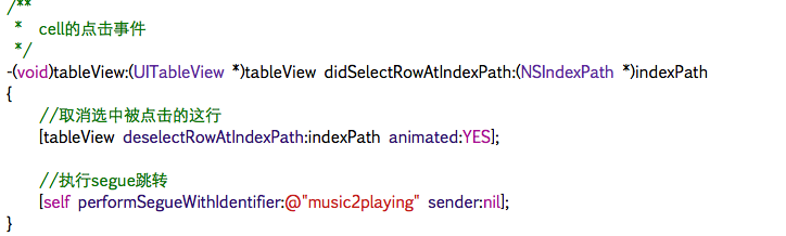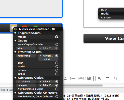 可以使用模態的方法,添加一個控制器,讓這個控制器和音樂播放控制器類進行關聯,脫線,設置標識符且在cell的點擊事件中執行segue即可。