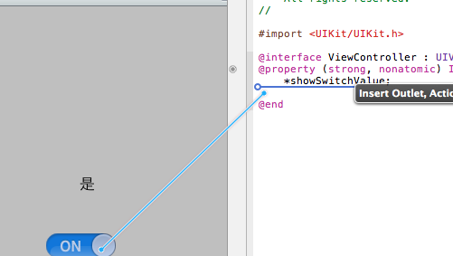 2、按alt+command + return鍵開啟Assistant Editor模式,選中UISwitch控件,按住Control鍵,往ViewController.h拖拽