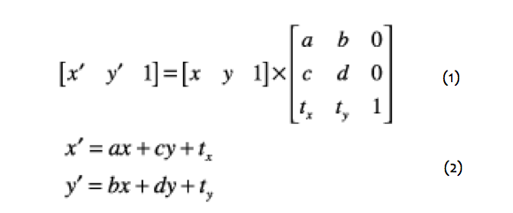 設x,y分別代表在原坐標系統中的位置,x',y'代表通過矩陣變化以后在新的系統中的位置。其中式1就是矩陣變化的公式,對式1進行展開以后就可以得到式2。從式2我們可以清楚的看到(x,y)到(x',y')的變化關系。