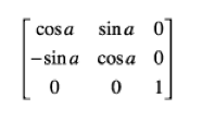 假設不做平移和縮放操作,那么從原坐標系中的一點(x,y)旋轉α°以后到了新的坐標系中的一點(x',y'),那么旋轉矩陣如下: