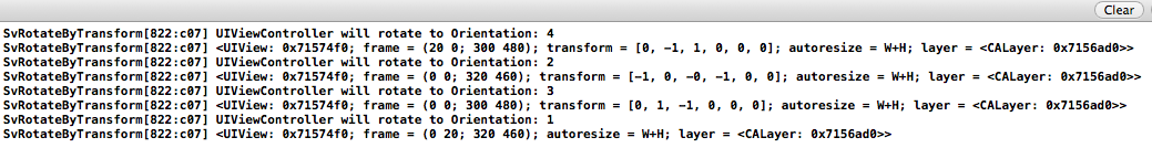 查看代碼我們可以發現,我們的viewController支持四個方向,然后在旋轉完成的didRotateFromInterfaceOrientation函數中打印了self.view的信息,旋轉一圈我們可以看到如下輸出: