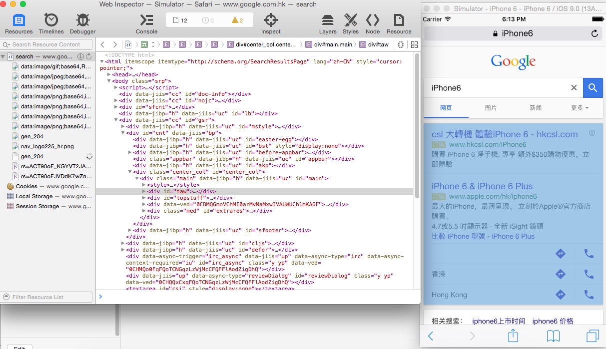首先,對action type的選擇,這里很明顯是對網頁內容的攔截,我們選擇的type值為css-display-none,接著獲取我們要隱藏的html元素,這里我們借助Mac版Safari的網頁源碼分析工具,打開Mac版Safari,選擇Develop menu下的simulator,然后選擇正在瀏覽的www.Google.com.hk頁面,Web Inspector工具隨即將simulator上Safari正在瀏覽的網頁源碼陳列出來。什么,沒有Develop menu?在Mac Safari的preference里選擇advance選項,將Show Develop menu in menu bar選項選擇就有了。接下來,我們很輕松地找到了廣告對應的div和它對應的id。