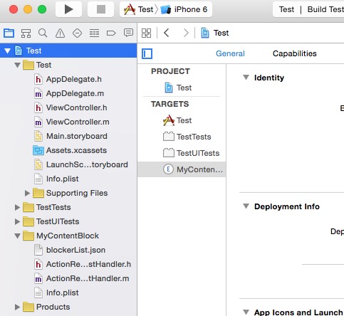 [ { "action": { "type": "css-display-none", "selector":"div#taw" }, "trigger": { "url-filter": "google.com.hk/" } }]激動人心的時刻到了,接下來讓我們見證成敗,運行工程,記住,不要選擇了Content Blocker的target,那樣子雖然也能將json嵌入Safari,但是死活是無效的,也許是beta版的bug。