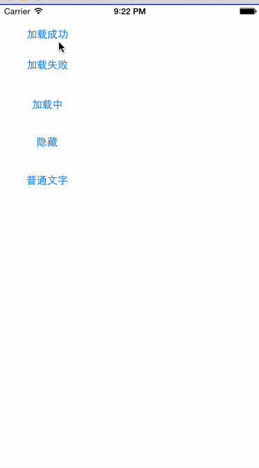 [[XZMStatusBarHUD sharedXZMStatusBarHUD] showSuccess:@"加載成功" position:0 animaDelay:0 configuration:^() {/** 設置透明度 */[XZMStatusBarHUD sharedXZMStatusBarHUD].statusAlpha = 0.7;/** 設置提醒框的背景顏色 */[XZMStatusBarHUD sharedXZMStatusBarHUD].statusColor = [UIColor blueColor];}];position:可設置狀態欄的提醒款的位置 默認值為0animaDelay:可以設置動畫的持續時間, 0代表默認值:1.0正在加載中 并設置提醒框的背景顏色