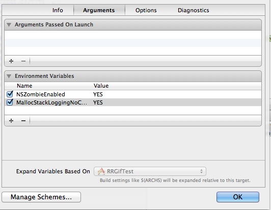(通過Product->Scheme->Edit Scheme進入下面編輯頁面,選中Arguments tab,增加標計位NSZombieEnabled設為YES)