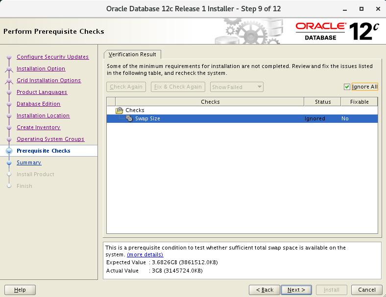 檢查先決條件,如果有不通過的會顯示在上面,因為是實驗環境swap空間直接忽略就行