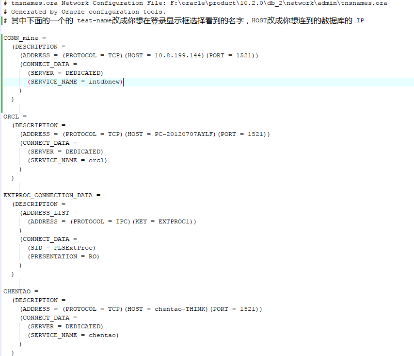 test-name = (DESCRIPTION = (ADDRESS = (PROTOCOL = TCP)(HOST = 10.8.199.144)(PORT = 1521)) (CONNECT_DATA = (SERVER = DEDICATED) (SERVICE_NAME = intdbnew) ) )