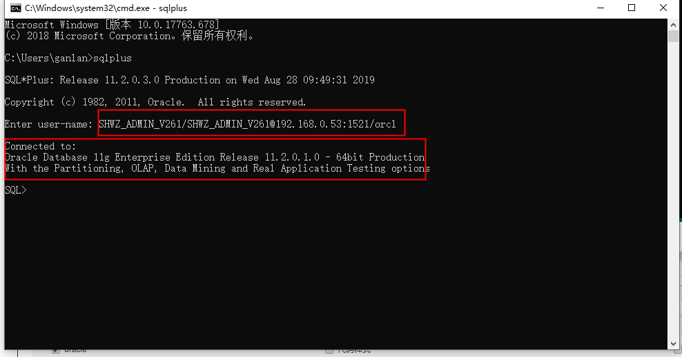 4、進行連接數(shù)據(jù)庫,輸入命令連接成功:用戶名/密碼@IP:端口/標識