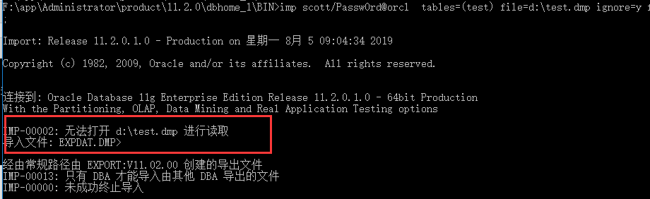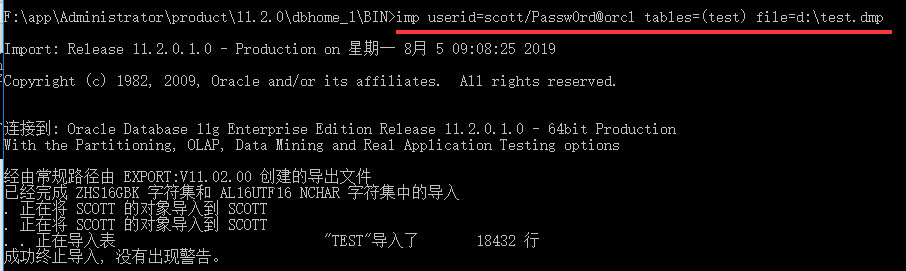 imp userid=scott/test@orcl full=y file=d:/test.dmp