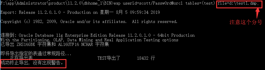 例: exp userid=scott/test@orcl tables=(test) file=d:/test.dmp
