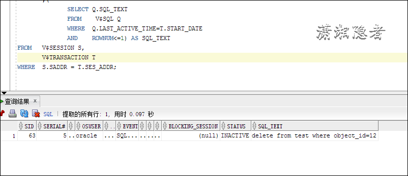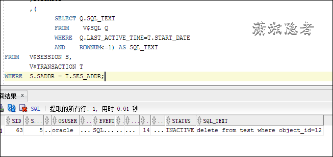 SQL> create table test 2 as 3 select * from dba_objects; Table created.SQL> select userenv('sid') from dual; USERENV('SID')-------------- 63 SQL> delete from test where object_id=12; 1 row deleted. SQL> 然后我們在會話2(SID=70)中,我們使用下面SQL查詢未提交的SQL語句。如下所示: