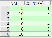 SELECT val,COUNT(*) FROM(SELECT ID,val,dense_rank() OVER(ORDER BY ID)-dense_rank() OVER(PARTITION BY val ORDER BY ID) xFROM LCY )GROUP BY val,x ORDER BY MIN(ID);