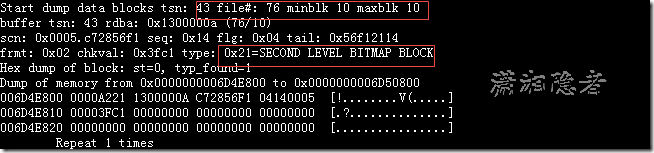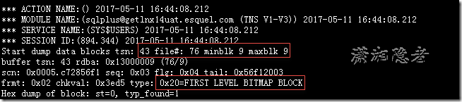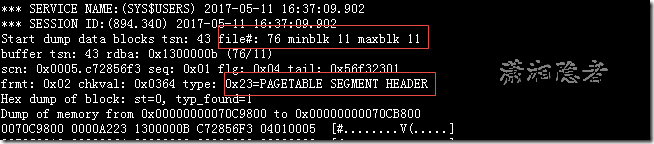 SQL> alter system dump datafile 76 block 9; System altered. SQL> alter system dump datafile 76 block 10; System altered. SQL> alter system dump datafile 76 block 11; System altered. SQL> select user_dump.value 2 || '/' 3 || lower(instance.value) 4 || '_ora_' 5 || v$process.spid 6 || nvl2(v$process.traceid, '_' 7 || v$process.traceid, null) 8 || '.trc'"trace file" 9 from v$parameter user_dump 10 cross join v$parameter instance 11 cross join v$process 12 join v$session 13 on v$process.addr = v$session.paddr 14 where user_dump.name = 'user_dump_dest' 15 and instance.name = 'instance_name' 16 and v$session.audsid = sys_context('userenv', 'sessionid'); trace file--------------------------------------------------------------------------------/u01/app/oracle/admin/SCM2/udump/scm2_ora_22642.trc第一個區的第一個塊(block_id=9)是FIRST LEVEL BITMAP BLOCK,第二個塊(block_id=10)是SECOND LEVEL BITMAP BLOCK,這兩個塊是用來管理free block的,第三個塊(block_id=11)是PAGETABLE SEGMENT HEADER,這個塊才是segment里的HEADER_BLOCK,再后面的塊就是用來記錄數據的