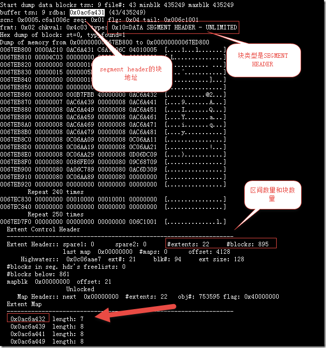 Segment Header是一個Segment的第一個extent的頭塊(第一個塊)。在FLM管理的Segment中,header block始終是segment 的第一個塊。 如下所示,在Extent Map中,第一個區間的地址為0x0ac6a432, 恰恰跟segment header的塊地址 0x0ac6a431 相差為1,這意味著后面的分配是緊挨著segment header的塊地址。 所以在手工段空間管理(Manual Segment Space Management)的表空間,不能以block_id的大小順序來看區間分配順序。也就是說FILE_ID=39 BLOCK_ID=427785的塊并不是第一個區間的第一個塊。這也是我在實驗當中糾結了好久的地方。