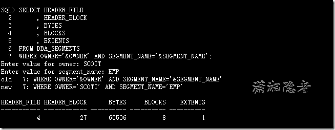 SELECT HEADER_FILE , HEADER_BLOCK , BYTES , BLOCKS , EXTENTS FROM DBA_SEGMENTS WHERE OWNER='&OWNER' AND SEGMENT_NAME='&SEGMENT_NAME';