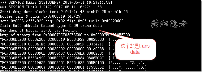 不過有一個奇怪的現象,對SCOTT.EMP其數據塊做dump,發現25、26、27數據塊的type都是trans data,0x06表示的Block Type為 Table/cluster/index segment data block 。 不知是否因為SCOTT.EMP對象位于USERS表空間下的緣故。不過USER表空間也是ASSM管理的。具體情況尚不清楚?