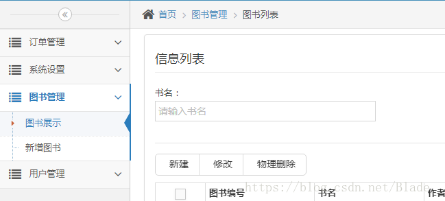 create table menu( menu_id number(10) primary key, menu_name varchar(30), menu_url varchar(200), parent_menu_id number(10) ); /*如果菜單是一級菜單,p_menu_id為0*/ insert into menu values(1,'圖書管理','',0); insert into menu values(2,'訂單管理','',0); insert into menu values(3,'用戶管理','',0); insert into menu values(4,'系統設置','',0); insert into menu values(5,'圖書展示','/system/updatePassword.action',1); insert into menu values(6,'新增圖書','',1); insert into menu values(7,'訂單分類','',2); insert into menu values(8,'新建訂單','',2); insert into menu values(9,'用戶信息','',3); insert into menu values(10,'用戶信息設置','',3); insert into menu values(11,'管理員信息','',4); insert into menu values(12,'管理員權限設置','',4);
