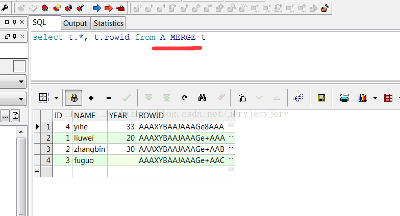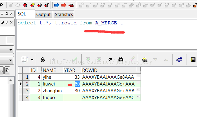 merge完之后A_MERGE表數據截圖如下:可以發現僅僅更新了AID=1的年齡,沒有插入AID=4的數據