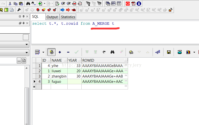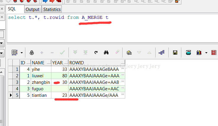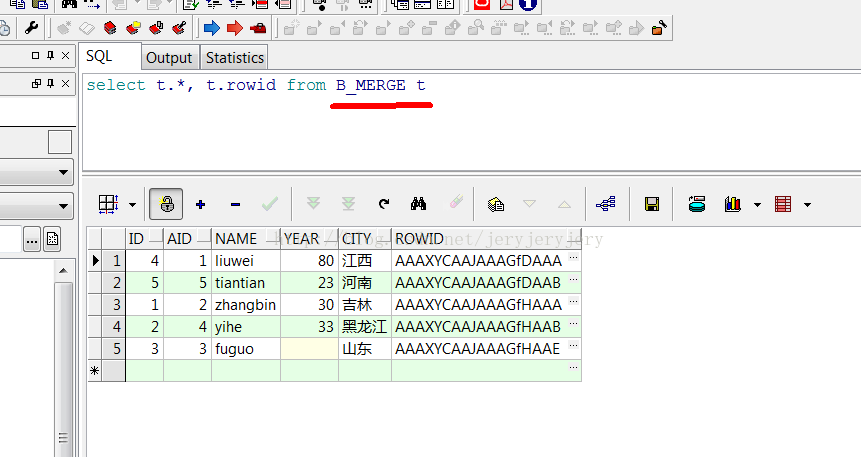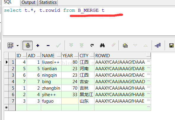 insert into A_MERGE values(1,'liuwei',20); insert into A_MERGE values(2,'zhangbin',21); insert into A_MERGE values(3,'fuguo',20); commit; insert into B_MERGE values(1,2,'zhangbin',30,'吉林'); insert into B_MERGE values(2,4,'yihe',33,'黑龍江'); insert into B_MERGE values(3,3,'fuguo',,'山東'); commit;