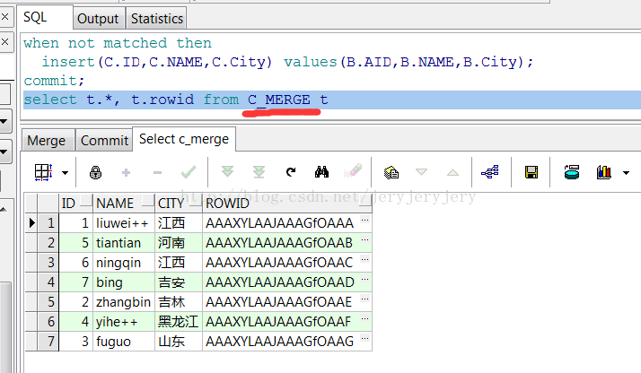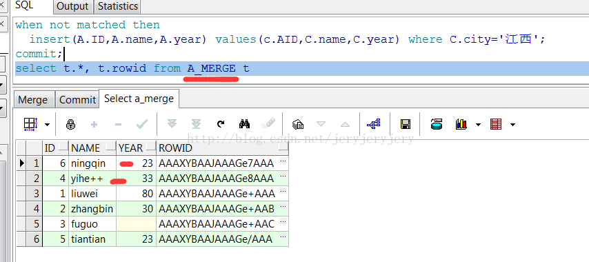 merge into A_MERGE A USING (select B.AID,B.name,B.year,B.city from B_MERGE B) C ON(A.id=C.AID) when matched then update SET A.name=C.name where C.city != '江西' when not matched then insert(A.ID,A.name,A.year) values(c.AID,C.name,C.year) where C.city='江西'; commit;