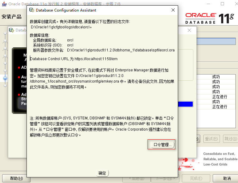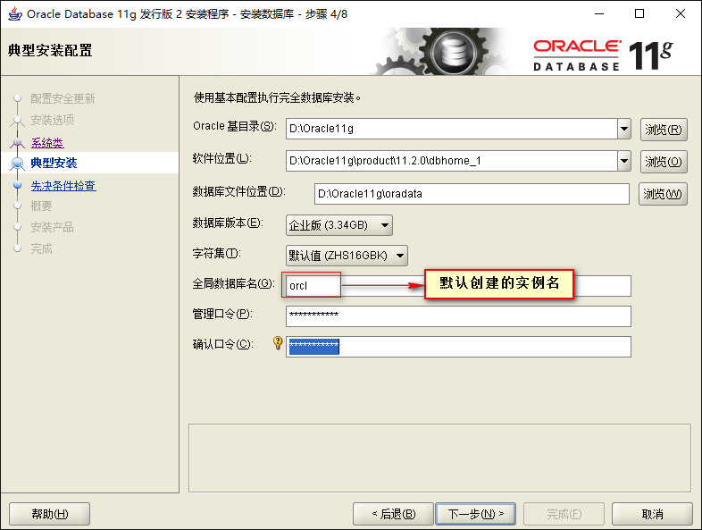 6) 設(shè)置安裝路徑、實(shí)例orcl的密碼