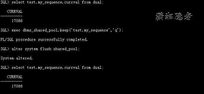 =====================PARSING IN CURSOR #25 len=129 dep=1 uid=0 oct=6 lid=0 tim=1504236336294194 hv=2635489469 ad='bf780410' sqlid='4m7m0t6fjcs5x'update seq$ set increment$=:2,minvalue=:3,maxvalue=:4,cycle#=:5,order$=:6,cache=:7,highwater=:8,audit$=:9,flags=:10 where obj#=:1END OF STMTPARSE #25:c=0,e=21,p=0,cr=0,cu=0,mis=0,r=0,dep=1,og=4,plh=1935744642,tim=1504236336294194BINDS #25: Bind#0 oacdty=02 mxl=22(02) mxlc=00 mal=00 scl=00 pre=00 oacflg=18 fl2=0001 frm=00 csi=00 siz=24 off=0 kxsbbbfp=bf45ca48 bln=24 avl=02 flg=09 value=1 Bind#1 oacdty=02 mxl=22(02) mxlc=00 mal=00 scl=00 pre=00 oacflg=18 fl2=0001 frm=00 csi=00 siz=24 off=0 kxsbbbfp=bf45ca5a bln=24 avl=02 flg=09:/17086 Bind#3 oacdty=02 mxl=22(22) mxlc=00 mal=00 scl=00 pre=00 oacflg=08 fl2=0001 frm=00 csi=00 siz=24 off=0 kxsbbbfp=2b7d80f57350 bln=24 avl=01 flg=05 value=0 Bind#4 oacdty=02 mxl=22(22) mxlc=00 mal=00 scl=00 pre=00 oacflg=08 fl2=0001 frm=00 csi=00 siz=24 off=0 kxsbbbfp=2b7d80f57320 bln=24 avl=01 flg=05 value=0 Bind#5 oacdty=02 mxl=22(02) mxlc=00 mal=00 scl=00 pre=00 oacflg=18 fl2=0001 frm=00 csi=00 siz=24 off=0 kxsbbbfp=bf47b85e bln=24 avl=02 flg=09 value=40 Bind#6 oacdty=02 mxl=22(04) mxlc=00 mal=00 scl=00 pre=00 oacflg=18 fl2=0001 frm=00 csi=00 siz=24 off=0 kxsbbbfp=bf47b870 bln=24 avl=04 flg=09 value=17086 Bind#7 oacdty=01 mxl=32(32) mxlc=00 mal=00 scl=00 pre=00 oacflg=18 fl2=0001 frm=01 csi=873 siz=32 off=0 kxsbbbfp=bf47b882 bln=32 avl=32 flg=09 value="--------------------------------" Bind#8 oacdty=02 mxl=22(22) mxlc=00 mal=00 scl=00 pre=00 oacflg=08 fl2=0001 frm=00 csi=00 siz=24 off=0 kxsbbbfp=2b7d80f572f0 bln=24 avl=02 flg=05 value=8 Bind#9 oacdty=02 mxl=22(22) mxlc=00 mal=00 scl=00 pre=00 oacflg=08 fl2=0001 frm=00 csi=00 siz=24 off=0 kxsbbbfp=2b7d80f57380 bln=22 avl=04 flg=05 value=97760EXEC #9:c=999,e=709,p=0,cr=1,cu=2,mis=0,r=1,dep=1,og=4,plh=1935744642,tim=1504236336297033CLOSE #9:c=0,e=2,dep=1,type=3,tim=1504236336297058mealink上提到了使用dbms_shared_pool.keep將對象在鎖定在shared pool 中,永遠不釋放。這樣可以防止FLUSH SHARED POOL導致序列跳號,但是這個無法避免數據庫異常關閉或CRASH引起的跳號SQL> select test.my_sequence.currval from dual; CURRVAL---------- 17086SQL> exec dbms_shared_pool.keep('test.my_sequence','q');PL/SQL procedure successfully completed.SQL> alter system flush shared_pool;System altered.SQL> select test.my_sequence.currval from dual; CURRVAL---------- 17086SQL> shutdown abortORACLE instance shut down.SQL> startupORA-32004: obsolete or deprecated parameter(s) specified for RDBMS instanceORACLE instance started.Total System Global Area 1620115456 bytesFixed Size 2213816 bytesVariable Size 1258293320 bytesDatabase Buffers 352321536 bytesRedo Buffers 7286784 bytesDatabase mounted.Database opened.SQL> select test.my_sequence.nextval from dual; NEXTVAL---------- 17126