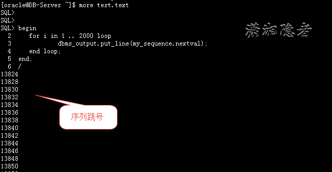 exec dbms_lock.sleep(2); --延遲2秒執行,根據你實驗情況調整/begin for i in 1 .. 2000 loop dbms_output.put_line(my_sequence.nextval); end loop;end;/