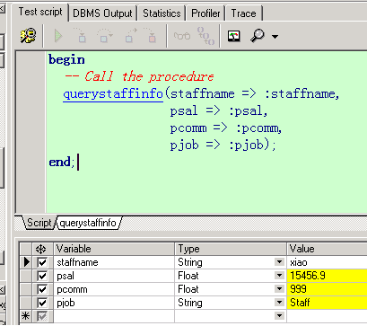 /**根據(jù)員工姓名,查詢員工的全部信息*/create or replace procedure QueryStaffInfo(staffName in xgj_test.username%type, pSal out number, pComm out xgj_test.comm%type, pJob out xgj_test.job%type) isbegin --查詢該員工的薪資,獎金和職位 select t.sal,t.comm,t.job into pSal,pComm,pJob from xgj_test t where t.username=staffName;end QueryStaffInfo;