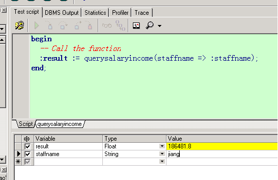 create or replace function querySalaryInCome(staffName in varchar2) return number as --定義變量保存員工的工資和獎金 pSalary xgj_test.sal%type; pComm xgj_test.comm%type;begin --查詢員工的工資和獎金 select t.sal, t.comm into pSalary, pComm from xgj_test t where t.username = staffName; --直接返回年薪 return pSalary * 12 + nvl(pComm,0);end querySalaryInCome;