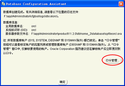 13. 實例數據庫創建完成了,系統 默認是把所有賬戶都鎖定不可用了(除sys和system賬戶可用外),建議點右邊的口令管理,將常用的scott賬戶解鎖并輸入密碼。 如圖:
