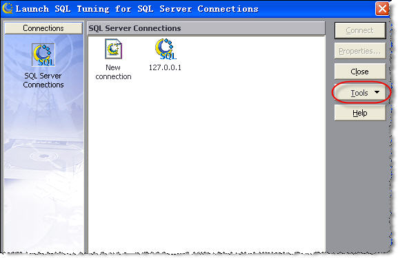 在Quest Central主界面上的“Database”樹上選擇“SQL Server”,然后在下方出現的“Tools”框中選擇“SQL Tuning”選項,打開“Lanch SQL Tuning for SQL Server Connections”對話框(圖2、圖3)。我們在這里建立數據庫服務器的連接,以后的分析工作都會在它上面完成。