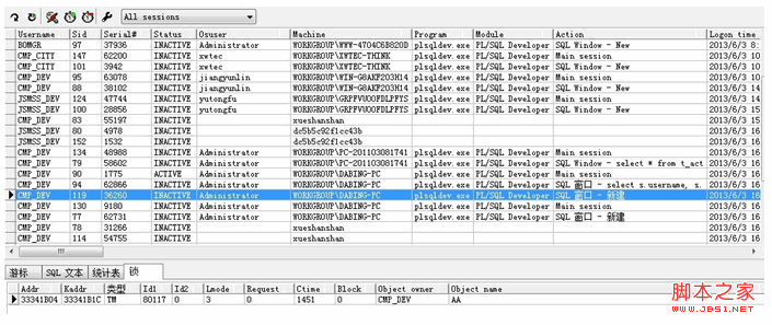 1、 查看當前被解鎖的對象 示例: 將表aa加鎖 執行 select * from aa for update; 方式一:通過SQL查詢 select 'alter system kill session ',''''||trim(t2.sid)||','||trim(t2.serial#)||''';' from v$locked_object t1,v$session t2 where t1.session_id=t2.sid order by t2.logon_time; 執行結果 方式二:在PL/SQL環境下 工具-->會話-->All sessions 通過點擊每條記錄,查看下面的 可以查看到被鎖住的表AA以及Sid,Serial#。 2、解鎖方式 使用DBA身份,通過執行 alter system kill session 'SID,SERIAL#';(例如本例中的alter system kill session '119,36260';)即可解鎖