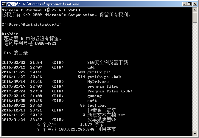 4、這時候在cmd中輸入dir,就可以看到d盤下的各個文件名稱了。
