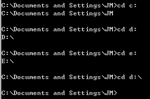 例如,我們打開命令行窗口的時候,一般是這樣操作的:在桌面左下角找到“開始”菜單,打開“運行”,輸入“cmd”,回車。這個時候,命令行窗口默認的當前目錄位于當前用戶所在的路徑下,比如:C:/Documents and Settings/JM,如下圖所示。