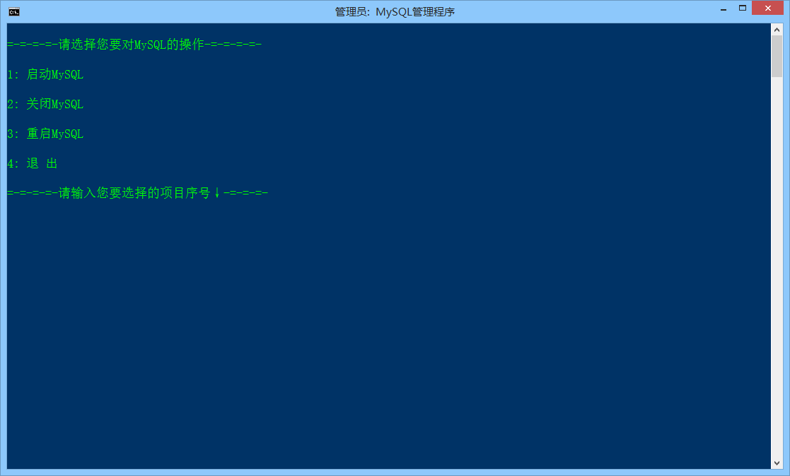 cls @echo off:設(shè)置窗口字體顏色color 0a :設(shè)置窗口標(biāo)題TITLE MySQL管理程序 call :checkAdmin goto menu:菜單:menuclsecho. echo.=-=-=-=-請選擇您要對MySQL的操作-=-=-=-=-echo.echo.1: 啟動MySQLecho.echo.2: 關(guān)閉MySQLecho. echo.3: 重啟MySQLecho. echo.4: 退 出echo.echo.=-=-=-=-請輸入您要選擇的項目序號↓-=-=-=-set /p id=if "%id%"=="1" goto startupif "%id%"=="2" goto shutdownif "%id%"=="3" goto rebootif "%id%"=="4" exitpause :啟動:startupecho.call :checkMySQL 1echo.啟動MySQL......net start "MySQL"echo.啟動MySQL成功!pause goto menu :停止:shutdownecho.call :checkMySQL 2echo.關(guān)閉MySQL......net stop "MySQL"echo.關(guān)閉MySQL成功!pause goto menu :重啟:rebootecho.call :checkMySQL 2echo.關(guān)閉MySQL......net stop "MySQL"echo.關(guān)閉MySQL成功!goto startupgoto menu :退出:gooutpausegoto menu :檢查MySQL進(jìn)程是否存在:checkMySQLset /a count=0for /f "tokens=1 delims= " %%i in ('tasklist /nh ^| find /i "MySQL"') do (set /a count+=1)if %count% neq 0 if "%1" equ "1" ( echo 警告:MySQL已啟動 goto goout)if %count% equ 0 if "%1" equ "2" ( echo 警告:MySQL未啟動 goto goout) :檢查是否是以管理員身份運行:checkAdminecho test am i admin? > %SystemRoot%/System32/test.sunhaoif not exist %SystemRoot%/System32/test.sunhao ( echo 警告:請以管理員身份運行! pause exit)del %SystemRoot%/System32/test.sunhao演示圖: