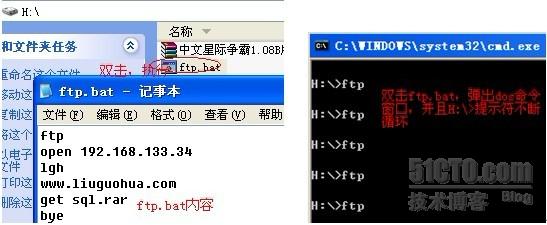 從圖上的結果看,bat腳本直接調用xp的FTP命令是不行的,執行時H:/>ftp會一直死循環。我這里的XP系統是SP3的,其它版本的,我沒有作測試。如果有不同,歡迎大家留言告之。