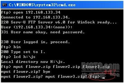 把XP機器上H:/js目錄下文件flower.zip 和flower2.zip上傳到FTP服務器