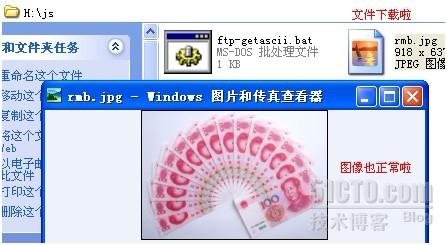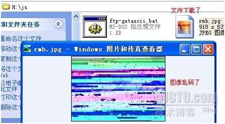 執行ftp-getascii.bat,看結果,rmb.jpg文件有下載到XP電腦里,雙擊這個文件,發現圖像亂碼,文件被破壞了,都是ascii碼傳輸惹的禍。