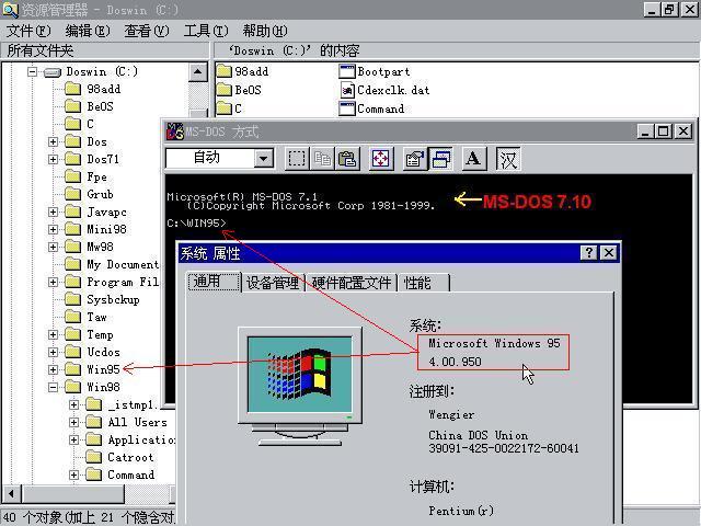 正因為MS-DOS 7.x的功能非常強大,微軟公司推出的Windows 9x等GUI程序就是用了一個經(jīng)過某些修改的精簡/特別版的MS-DOS 7.x內核來啟動的。而以上的MS-DOS 7.10完整安裝版和Windows 9x所帶的精簡版的DOS相比之下功能也自然更加豐富,性能也更加穩(wěn)定。也正由于MS-DOS 7.10的這些增強特點,所以在這個MS-DOS 7.10下可以直接進入Windows 3.x/9x等(畢竟Win3.x/9x只是DOS下的GUI程序),方法是先進入其相應的Windows文件夾/目錄,然后用相應的WIN命令即可進入相應的Windows 3.x/9x即可,或者通過修改MSDOS.SYS的路徑設置來直接實現(xiàn)。