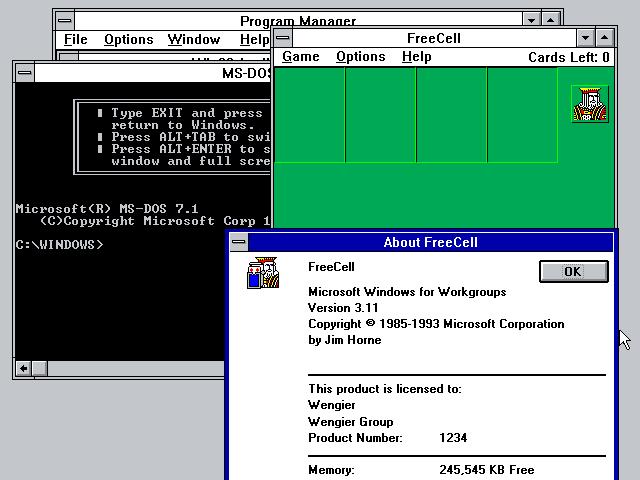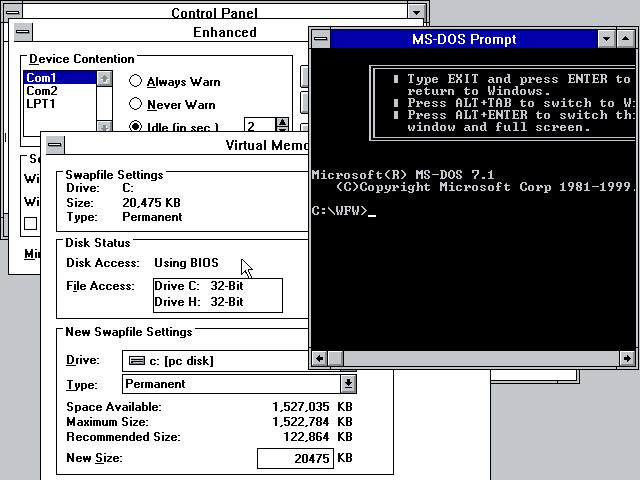 在MS-DOS 7.10下運行WFW 3.11 GUI并使用永久交換文件及32位存取