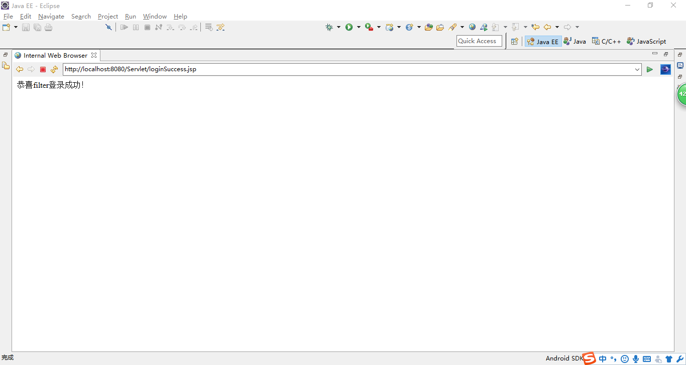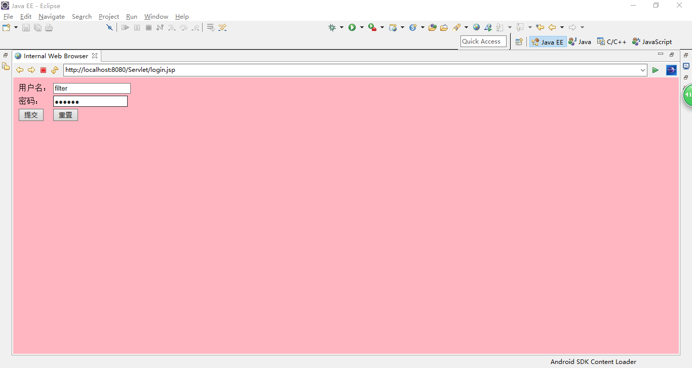 package servlet; import java.io.IOException; import javax.servlet.ServletException;import javax.servlet.annotation.WebServlet;import javax.servlet.http.HttpServlet;import javax.servlet.http.HttpServletRequest;import javax.servlet.http.HttpServletResponse;import javax.servlet.http.HttpSession; @WebServlet(name = "loginServlet", urlPatterns = { "/loginServlet" })public class LoginServlet extends HttpServlet { private static final long serialVersionUID = 1L; protected void doGet(HttpServletRequest request, HttpServletResponse response) throws ServletException, IOException { doPost(request, response); } protected void doPost(HttpServletRequest request, HttpServletResponse response) throws ServletException, IOException { String username = request.getParameter("name"); String password = request.getParameter("pwd"); if ("filter".equals(username) && "filter".equals(password)) { HttpSession session = request.getSession(true); session.setAttribute("user", username); response.sendRedirect("loginSuccess.jsp"); } else { response.sendRedirect("login.jsp"); } } }4.login.jsp里面的代碼如下所示: