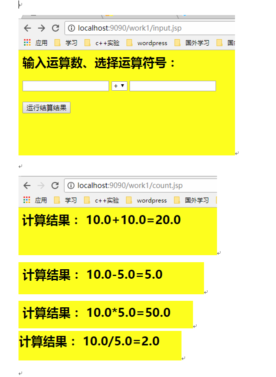 <%@ page language="java" import="java.util.*" contentType="text/html; charset=UTF-8" pageEncoding="UTF-8" %> <html> <head> <title>計算結果</title> <style> body { background-color: yellow; } </style> </head> <body> <h2>計算結果: <% String stra=request.getParameter("a"); String strb=request.getParameter("b"); String strc=request.getParameter("c"); float fa = Float.parseFloat(stra); float fc = Float.parseFloat(strc); System.out.print(strb); if(strb.equals("+")){ out.print(fa+strb+fc+"="+(fa+fc)); }else if(strb.equals("-")){ out.print(fa+strb+fc+"="+(fa-fc)); }else if(strb.equals("*")){ out.print(fa+strb+fc+"="+(fa*fc)); }else{ out.print(fa+strb+fc+"="+(fa/fc)); } %> </h2> </body> </html>實驗截圖