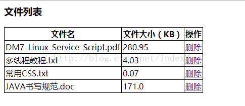 <html> <head> <title>上傳文件列表</title> </head> <body> <h3>文件列表</h3> <table class="acclist_tab" border="1" bordercolor="#000000" cellspacing="0" cellpadding="2" style="border-collapse:collapse;"> <tr> <th>文件名</th> <th>文件大小(KB)</th> <th>操作</th> </tr> <c:if test="${not empty accessoryList}"> <c:forEach items="${accessoryList}" var="acc"> <tr> <td>${acc.fileName}</td> <td>${acc.fileSize}</td> <td><a href="">刪除</a></td> </tr> </c:forEach> </c:if> </table> </body> </html> 創建展示列表Servlet:listUploadedFilesServlet
