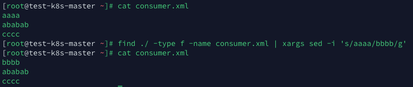 通過find命令查找當(dāng)前目錄下的所有子文件夾名稱為 consumer.xml 的文件,然管道給 sed ,通過-i把文件內(nèi)容替換。