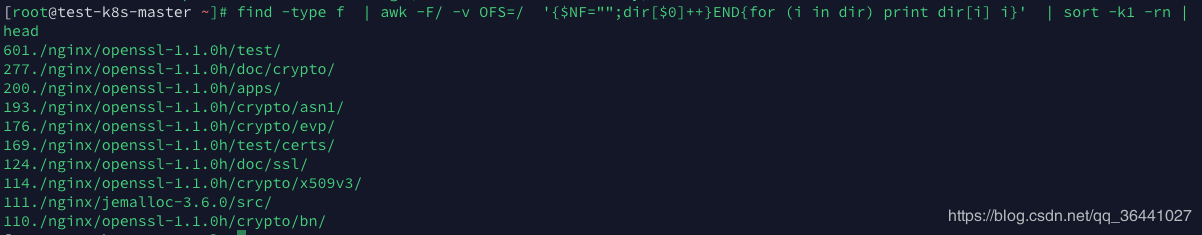 這條命令比較復(fù)雜,使用了find,awk,sort,head。