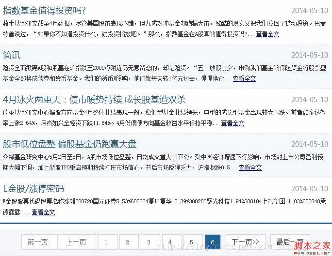if objNodes.length > 0 then i = 0 For j = (pSize*(pIndex-1)) to (pSize*pIndex-1) step 1 myTitle = objNodes(j).childNodes(0).text myDate = objNodes(j).childNodes(3).text myDescription = objNodes(j).childNodes(2).text link = Server.URLEncode(objNodes(j).childNodes(1).text) myLink = "http://www.fx678.com/news/currency/XH08NewsContent.asp?u=" & link %> <% if i Mod 2 = 0 then %> <li class="bg"> <% else %> <li> <% end if %> <h4> <span> <%= FormatDate(myDate,2) %> </span><a target="_blank" href="<%= myLink %>"> <%= myTitle %></a></h4> <p> <%= myDescription %> </p> </li> <% i = i + 1 Next Else Response.Write("暫無數據!") End If %> </ul> </div> <!-- 分頁信息 --> <div id="pageZone"> <% if pIndex = 1 then %> <span class="Disabled">第一頁</span> <span class="Disabled"><<上一頁</span> <span class="isNow number" title="您正在瀏覽本頁">1</span> <span class="number" title="第2頁"> <a href="zt_CFDL_List.asp?p=2">2</a> </span> <span class="number" title="第3頁"> <a href="zt_CFDL_List.asp?p=3">3</a> </span> <span class="number" title="第4頁"> <a href="zt_CFDL_List.asp?p=4">4</a> </span> <span class="number" title="第5頁"> <a href="zt_CFDL_List.asp?p=5">5</a> </span> <span class="number" title="第6頁"> <a href="zt_CFDL_List.asp?p=6">6</a> </span> <span title="轉到下一頁"> <a href="zt_CFDL_List.asp?p=<%= Cint(pIndex+1) %>">下一頁>></a> </span> <span title="轉到最后一頁"> <a href="zt_CFDL_List.asp?p=6">最后一頁</a> </span> <% elseif pIndex = 6 then %> <span class="Disabled"> <a href="zt_CFDL_List.asp?p=1">第一頁</a> </span> <span title="轉到上一頁"> <a href="zt_CFDL_List.asp?p=<%= Cint(pIndex-1) %>">上一頁</a> </span> <span class="number" title="第1頁"> <a href="zt_CFDL_List.asp?p=1">1</a> </span> <span class="number" title="第2頁"> <a href="zt_CFDL_List.asp?p=2">2</a> </span> <span class="number" title="第3頁"> <a href="zt_CFDL_List.asp?p=3">3</a> </span> <span class="number" title="第4頁"> <a href="zt_CFDL_List.asp?p=4">4</a> </span> <span class="number" title="第5頁"> <a href="zt_CFDL_List.asp?p=5">5</a> </span> <span class="number isNow" title="您正在瀏覽本頁">6</span> <span class="Disabled">下一頁>></span> <span class="Disabled" title="轉到最后一頁">最后一頁</span> <% else %> <span class="number"> <a href="zt_CFDL_List.asp?p=1">第一頁</a> </span> <span title="轉到上一頁"> <a href="zt_CFDL_List.asp?p=<%= Cint(pIndex-1) %>">上一頁</a> </span> <% for m = 1 to 6 step 1 if Cint(pIndex) = Cint(m) then %> <span class="number isNow" title="您正在瀏覽本頁"><%= m %></span> <% else %> <span class="number" title="第<%= m %>頁"> <a href="zt_CFDL_List.asp?p=<%= m %>"><%= m %></a> </span> <% end if next %> <span title="轉到下一頁"> <a href="zt_CFDL_List.asp?p=<%= Cint(pIndex+1) %>">下一頁>></a> </span> <span title="轉到最后一頁"> <a href="zt_CFDL_List.asp?p=6">最后一頁</a> </span> <% end if %> </div> </body> </html>